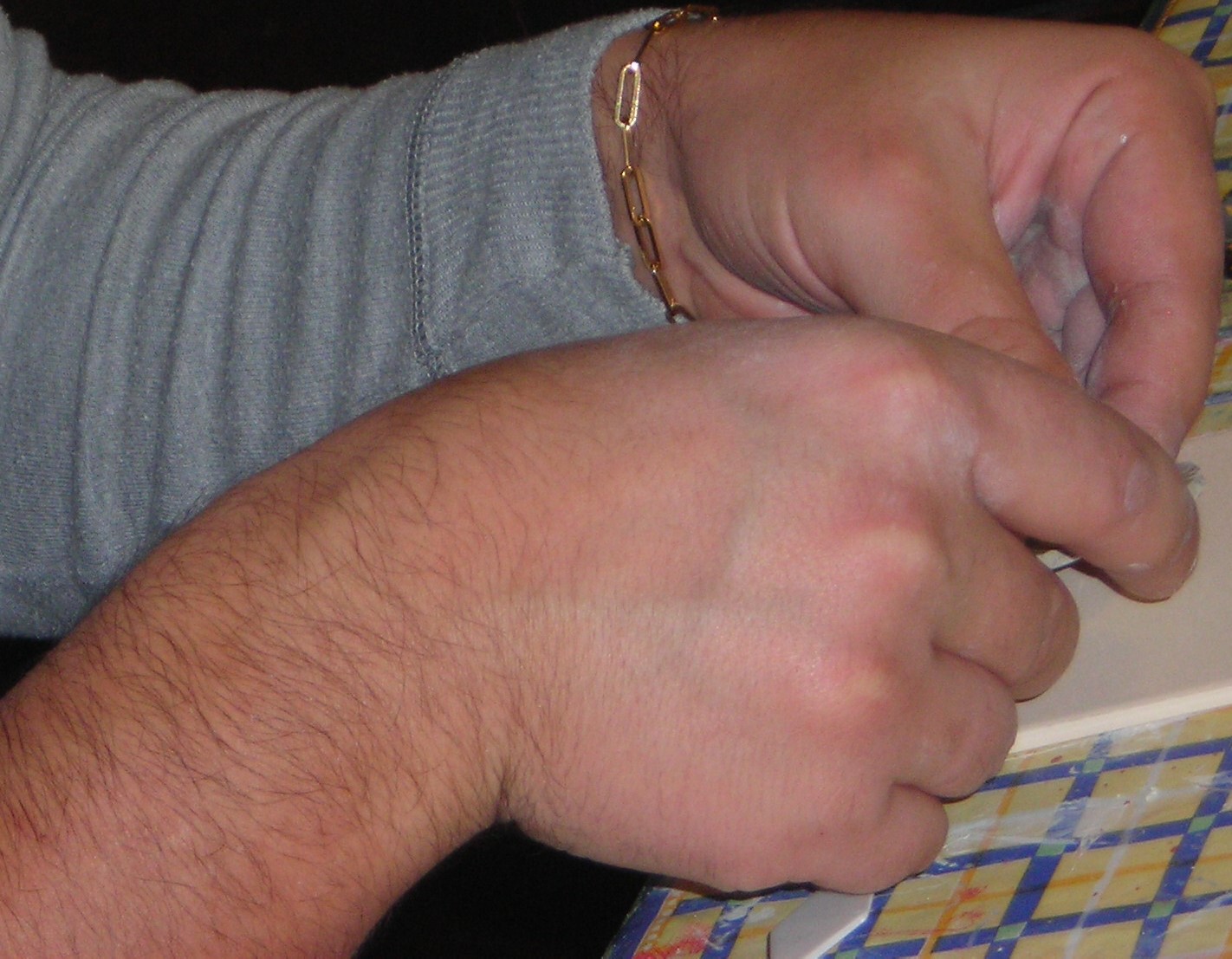 Paulo Caetano modela o alto-relevo que é colocado nos azulejos e pinta os azulejos.